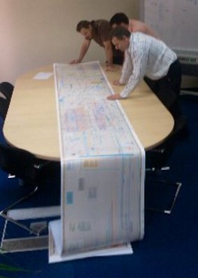 The first copy received from the printer. The picture shows (front to back) David Bothma, Marcel Roux and Jorrie Jordaan.
